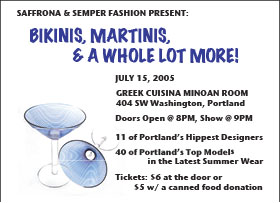 15 July 2005 - Saffrona co-hosts the Semper Fashion show "Bikinis, Martinis & a Whole Lot More" at the Greek Cuisine Grand Ballroom in Downtown Portland. Saffrona will show the 2005 - 2006 Resort Season Bikinis and Resortwear. Designers also participating in the show are Adrianna by Michelle, AnaBelle, Crazy Coconut Creations, Carolyn Claire Mitchell, Diego, DoubleCross Belt Co., Flood Clothing, Naomi Raquel, Sissy Wussy La La Girl, Sizzle, and Louise Jeans.