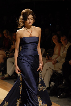 is the original line of beautiful party and event dresses and gowns that are created from silk crepes, dupionis, chiffons and charmeuses and now a seaweed / cotton blend with the feel of silk broadcloth.